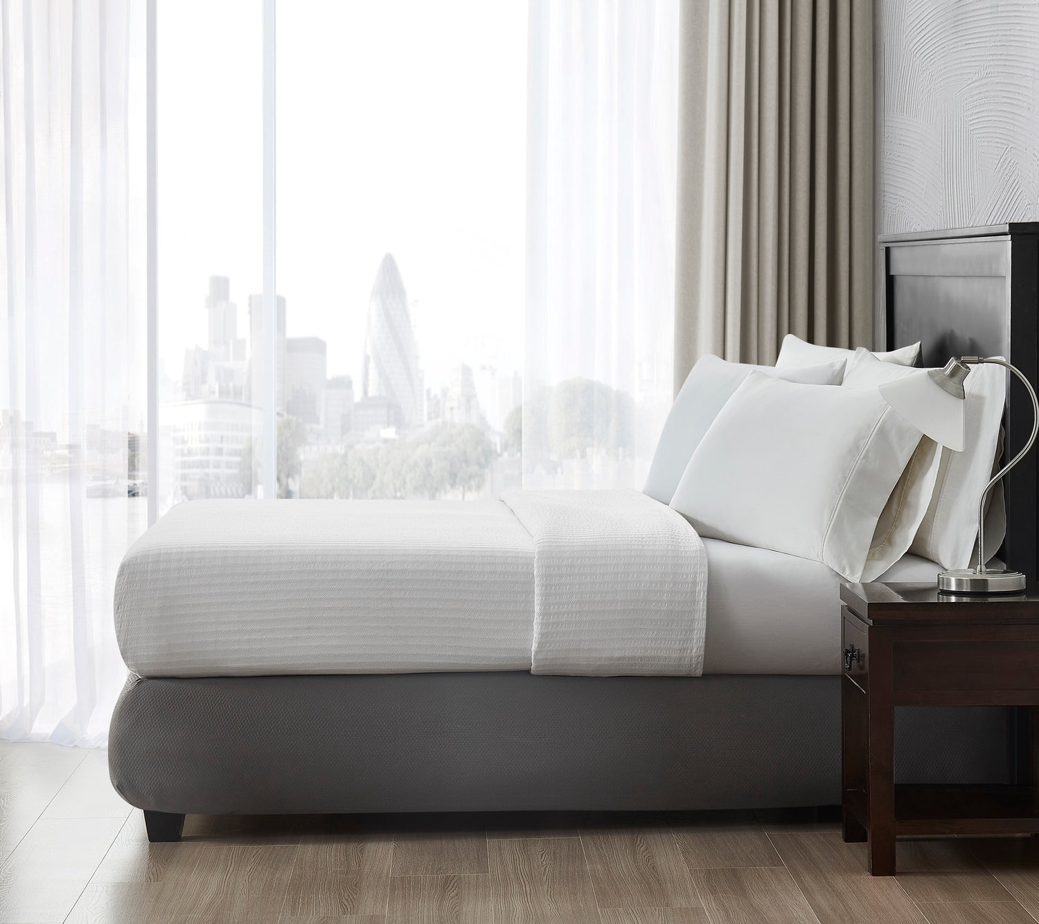 An intricate dobby woven with an alternating puckered stripe and honeycomb weave with a rich texture and a soft hand. This easy-care, no-iron top sheet is ideal for effortless housekeeping.