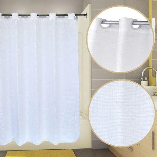 Pre-hooked Waffle View Shower Curtains offer an alternative to traditional Curtains and require no additional hooks. Pre-hooked Waffle View Curtains have a snap out liner and voile window to let light in. Specially designed to keep water in the tub and reduce the clean up time after Showers. Made from a luxurious blend of 60/40 cotton polyester with polyester voile window and snap liner made of 100% 300 Denier polyester. Available in white.