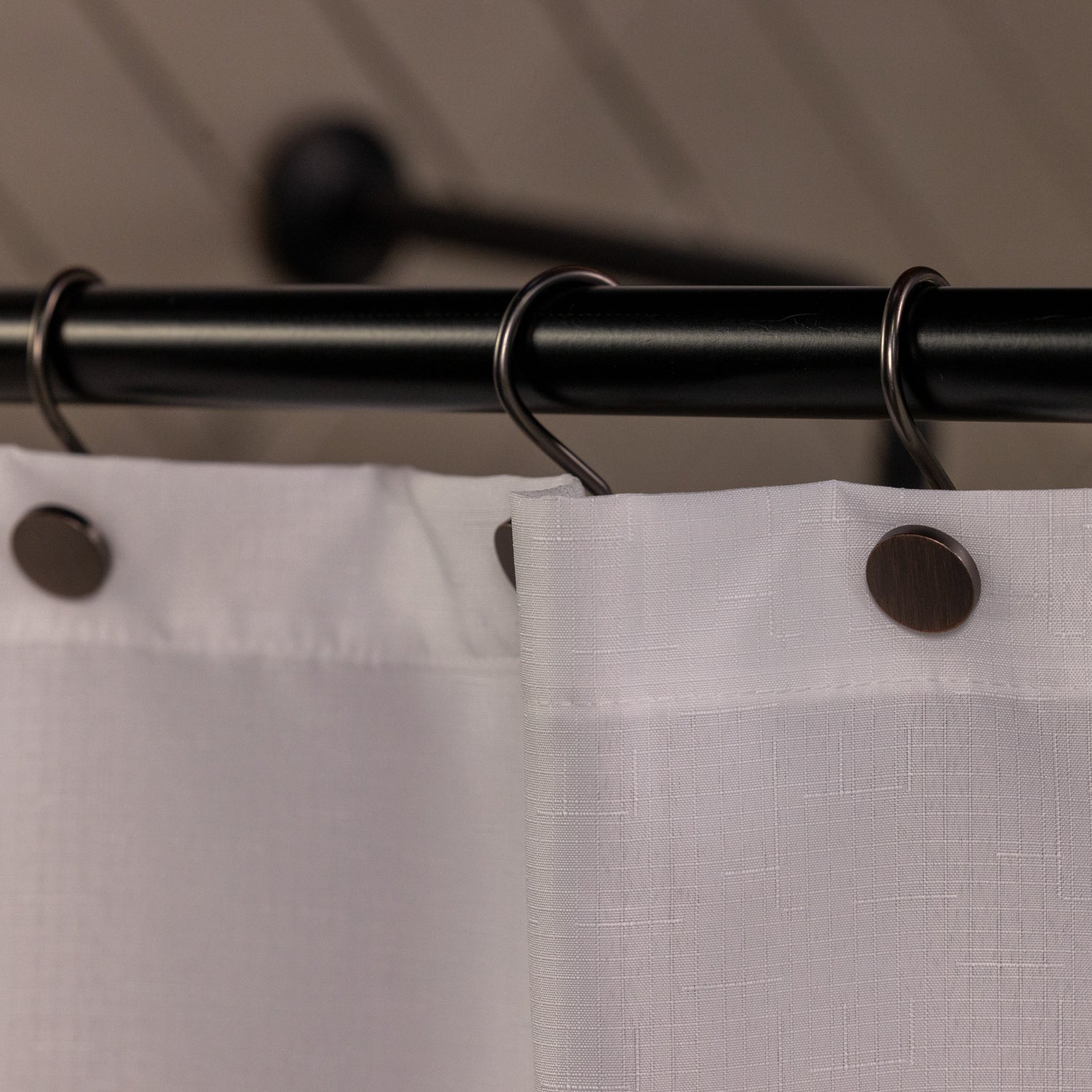 Textured shower curtain features a water-repellent, fluorine-free fabric made from 100% GRS-certified upcycled yarns.