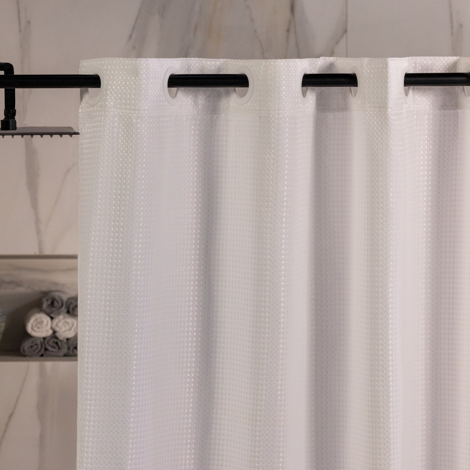 This easy-to-install, hookless shower curtain features a water-repellent, fluorine-free fabric made from 100% GRS-certified upcycled yarns. Available with a detachable, washable liner to reduce waste and extend product life.